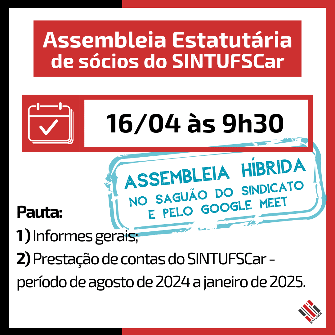 A primeira assembleia terá início às 9h30, é destinada aos sócios do SINTUFSCar e irá discutir a prestação de contas do sindicato no período de agosto de 2024 a janeiro de 2025.