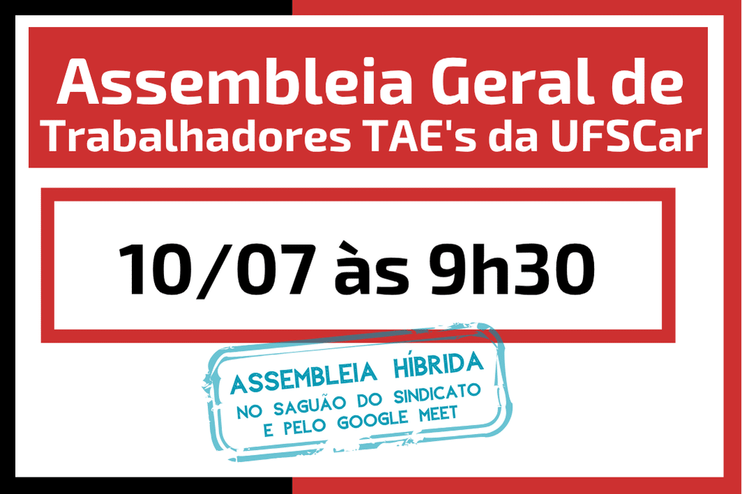 Nesta quinta-feira (10), a partir das 9h30, vamos realizar uma ASSEMBLEIA GERAL DE TAES DA UFSCAR!
