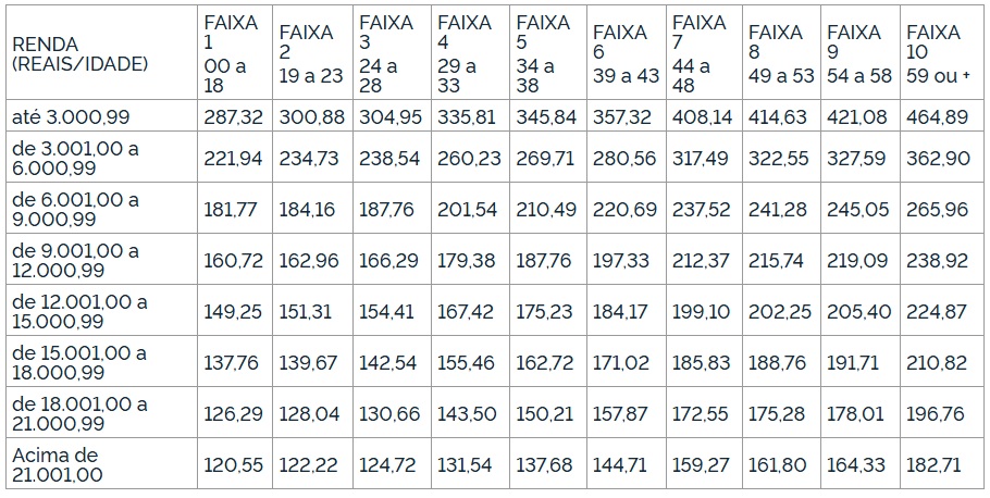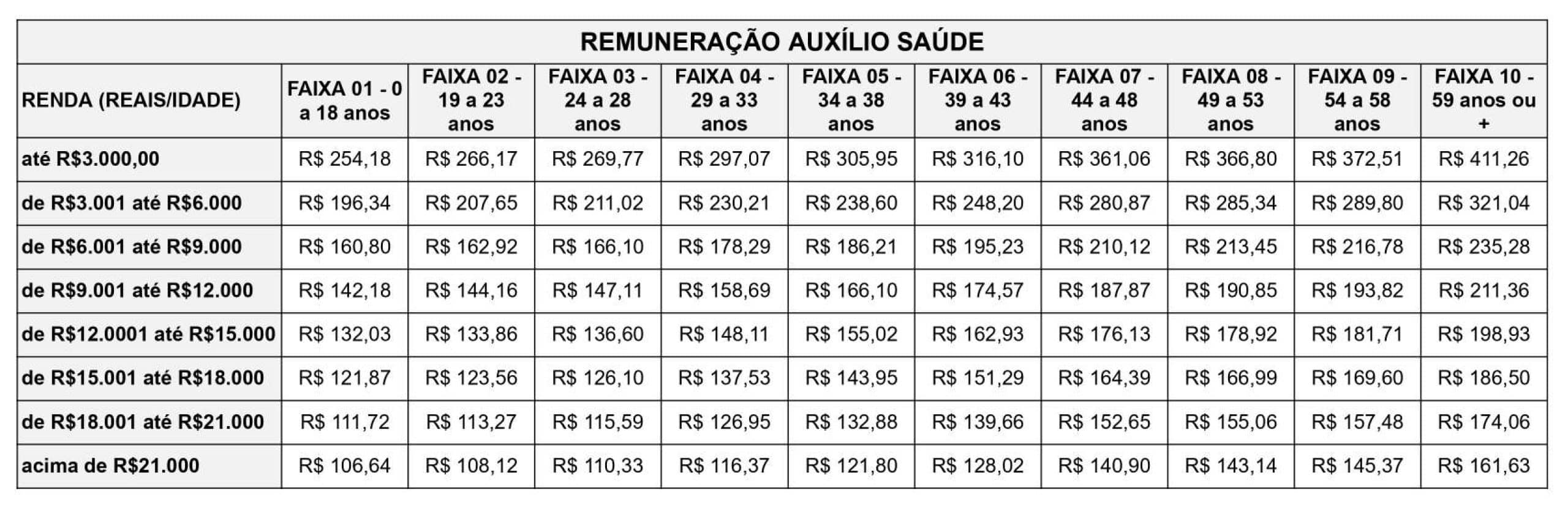 Os (as) servidores (as) que aderirem a planos de saúde que sigam as normas da ANS, têm direito a receber o Auxílio Saúde do Governo Federal, de acordo com idade e faixa salarial abaixo: