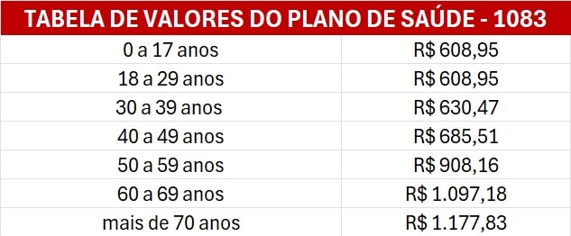 Veja abaixo os novos valores do plano de saúde 1083.