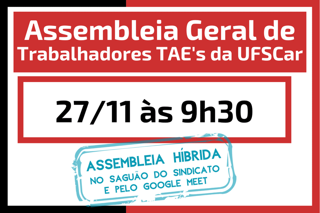 Nesta quinta-feira (27), às 9h30, vamos realizar uma ASSEMBLEIA GERAL DE TAES DA UFSCAR!