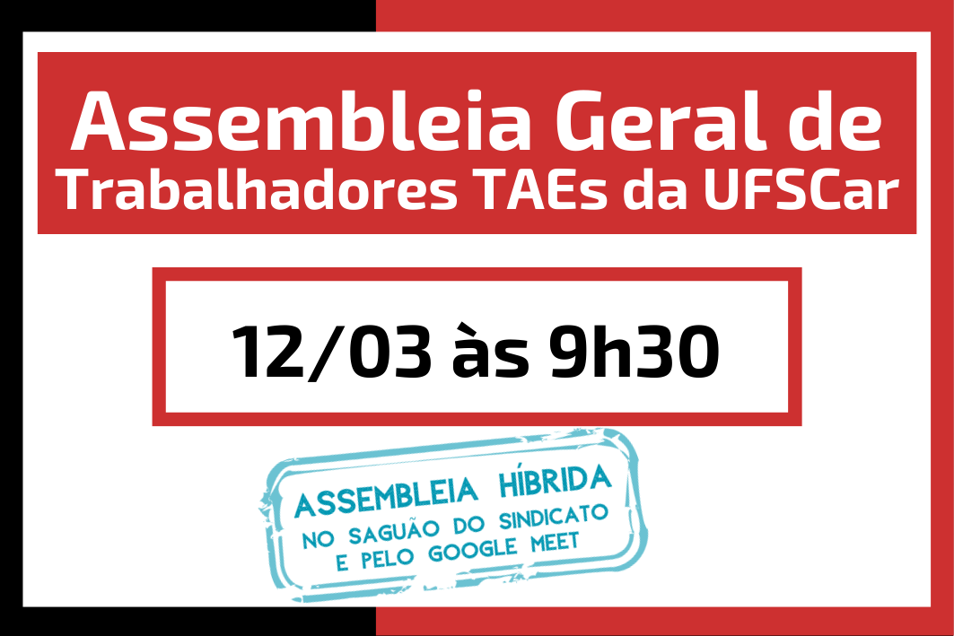 O SINTUFSCar convoca a categoria para uma Assembleia Geral, que será realizada de forma híbrida, no saguão do sindicato e via Google Meet, na próxima quarta-feira, dia 11 de fevereiro, a partir das 9h30.