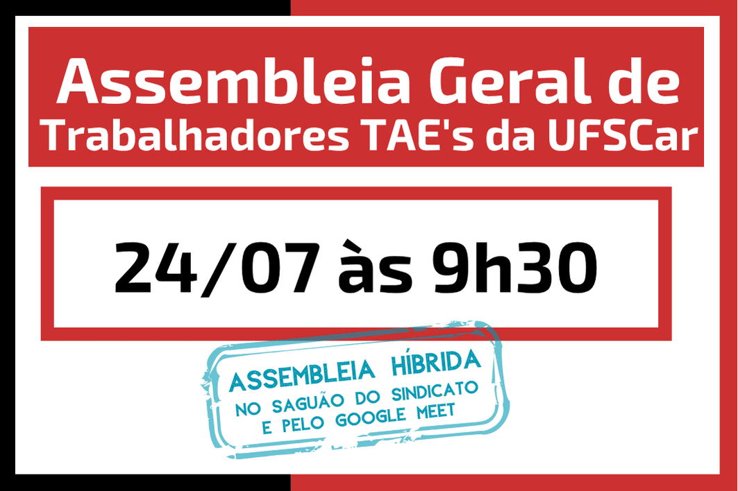 Nesta quinta-feira (24), às 9h30, vamos realizar uma ASSEMBLEIA GERAL DE TAES DA UFSCAR!