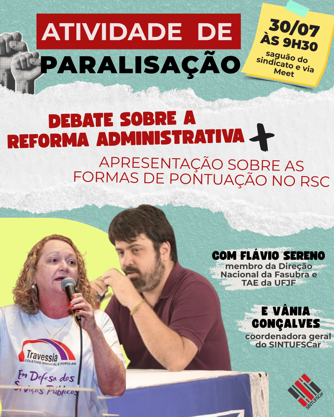 Nesta quarta-feira (30), a partir das 9h30, teremos um DEBATE SOBRE A REFORMA ADMINISTRATIVA + APRESENTAÇÃO DAS FORMAS DE PONTUAÇÃO NO RSC como atividade de paralisação!