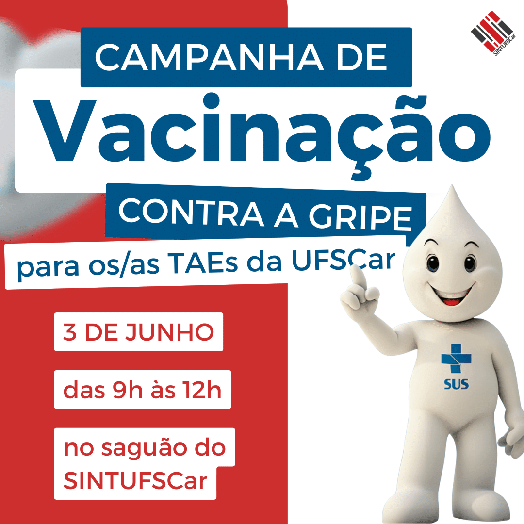 No dia 3 de junho, das 9h às 12h, haverá vacinação contra a gripe no saguão do sindicato para os/as técnico-administrativos da UFSCar de TODAS AS IDADES – da ativa ou aposentados/as!
